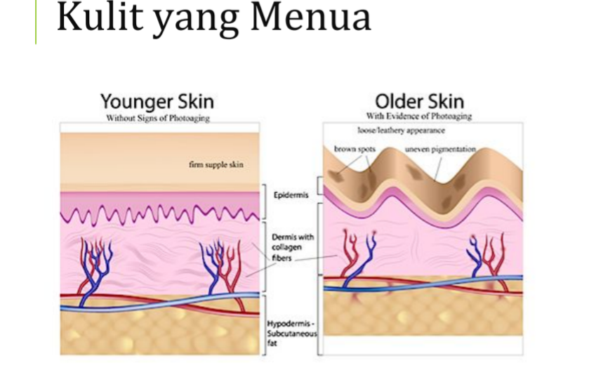 Kulit bisa mengalami penuaan juga lho.. jadi tidak hanya kita yang punya KTP dan umur bertambah.. kulit pun bisa menua dan keriput. Tetapi.. usia kulit bisa nampak jauh lebih muda dari usia asli kita. Seperti kata orang yang bertemu saya.. saya tidak nampak berumur 30an melainkan 20an.. (tersanjung pol sist!) Alhamdulillaaah..