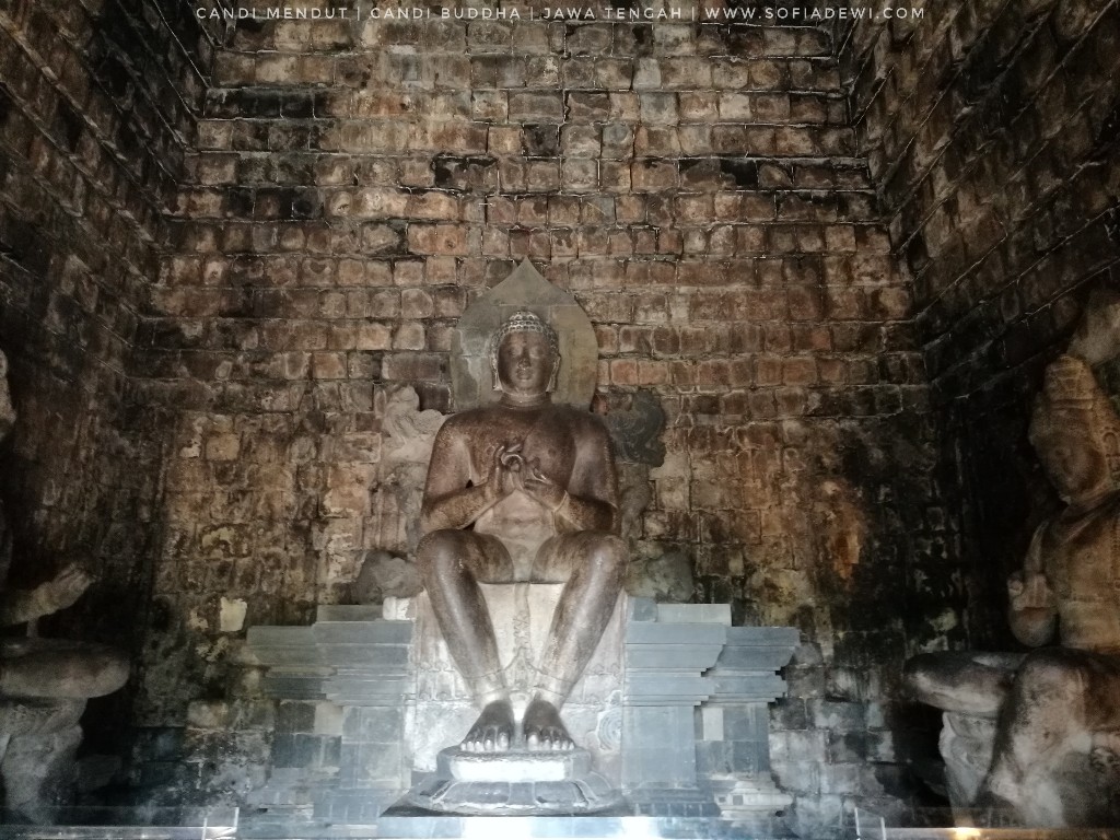 Masuk ke dalam ruangan utama Candi Mendut langsung maknyesss.. kenapa begitu? Beneran dingin sejuk sekali! Padahal di luar itu terik.. dan ini ruangan kecil.. tapi kok adem ya.. enak.. berasa gak pengen keluar .. kalo bukan karena gantian sama pengunjung lain hihihi…