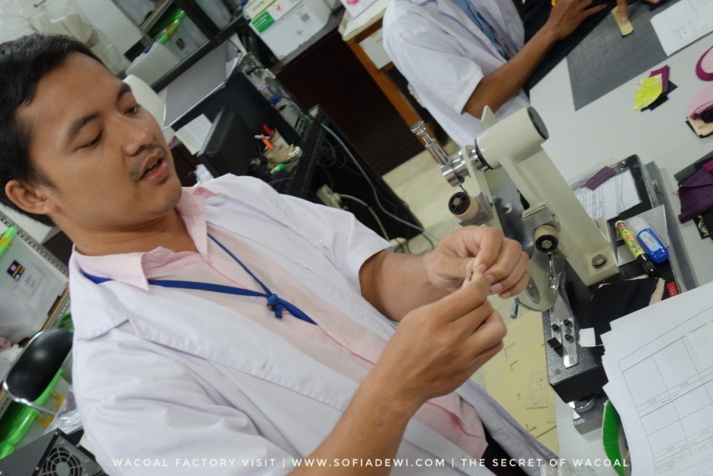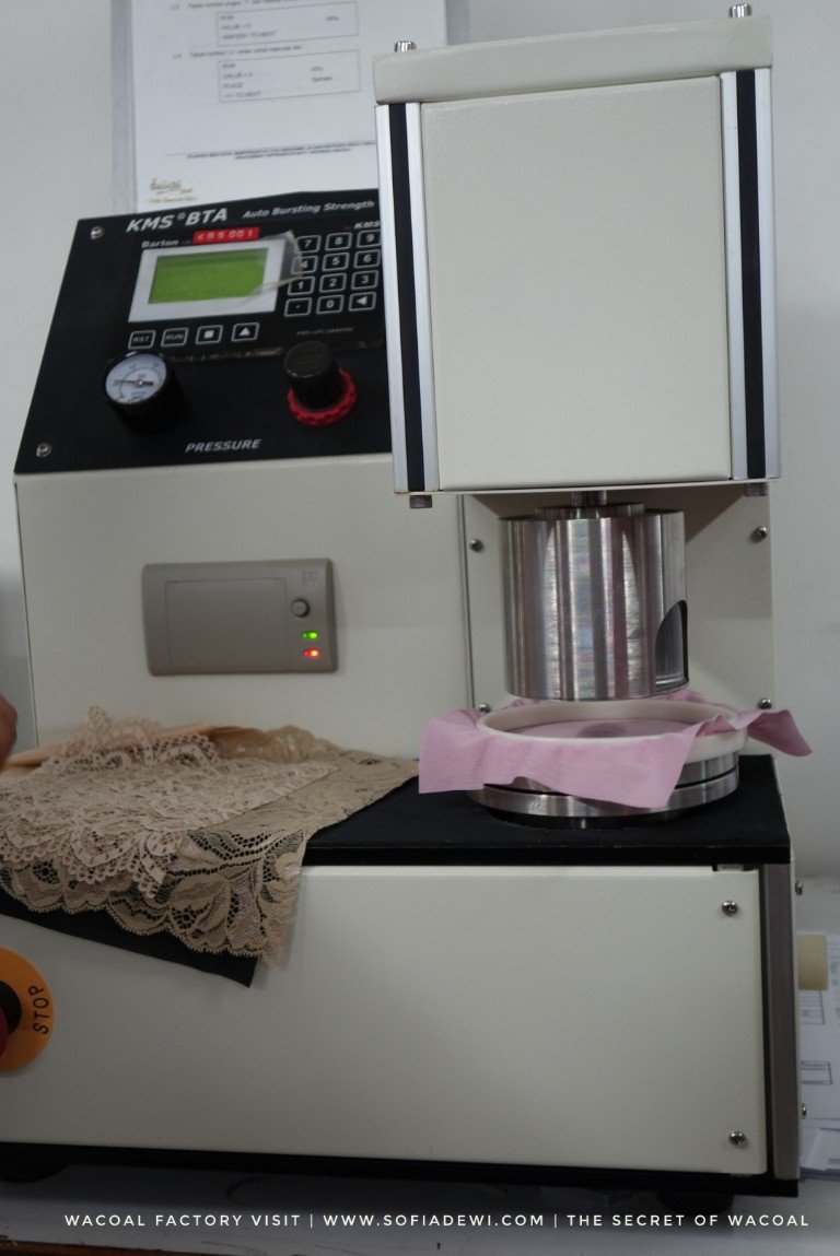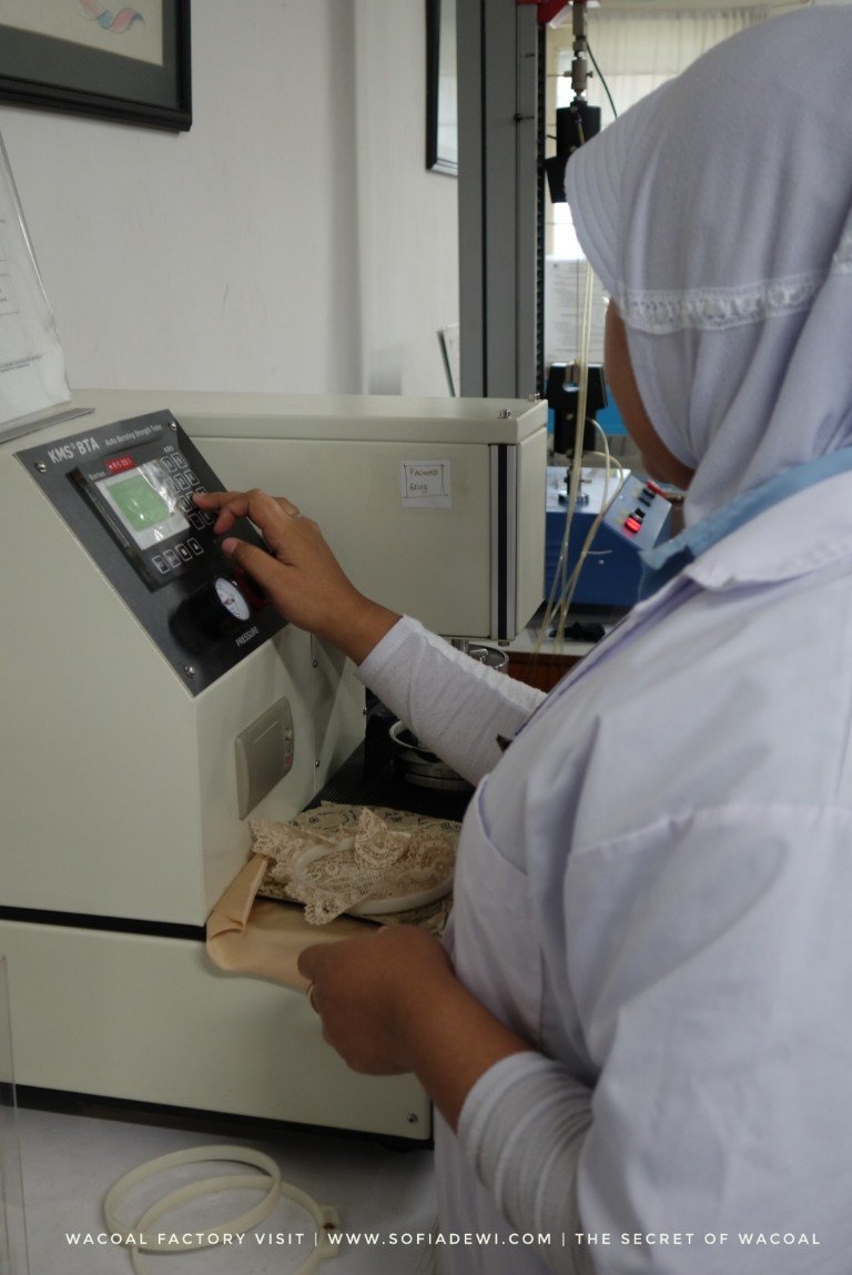 Seorang petugas lab sedang menjelaskan kepada kami tentang apa saja yang ditest dalam pembuatan bra. Khususnya untuk bahannya